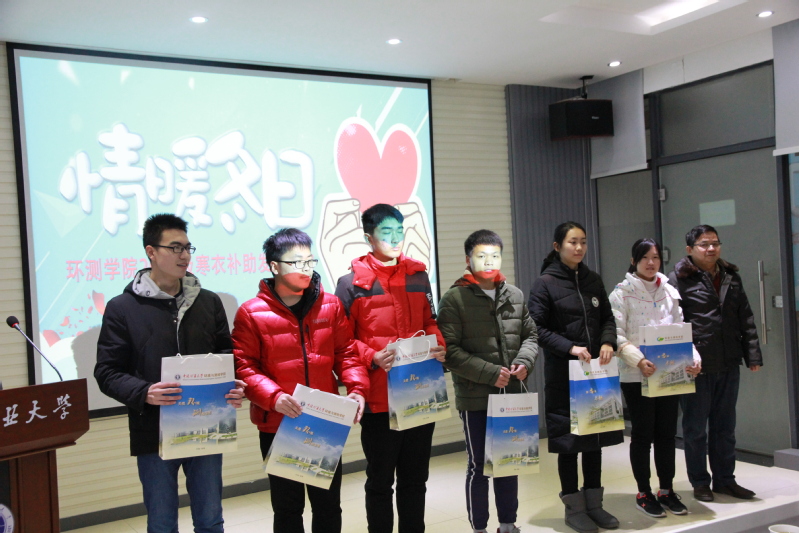 在环测楼A512会议室开展2017级“情暖冬日”寒衣补助发放活动。院党委书记李长贵,关工委常务副主任邱慎耕,党委副书记王守刚,工会主席刘汉湖以及18位受助同学参加了这次活动。17级辅导员李月主持了本次活动。