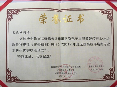 学子在“全国高校环境类专业本科生优秀毕业设计(论文)奖”评选中喜获佳绩,由环境工程专业何士龙副教授指导的陈悦同学毕业设计《上海市某垃圾填埋场渗滤液处理工艺设计》获优秀毕业设计奖,由环境科学专业路平副教授指导的孔亚东同学毕业论文《植物根系作用下隐孢子虫卵囊替代物土-水介质迁移规律与传播机制》获优秀毕业论文奖。