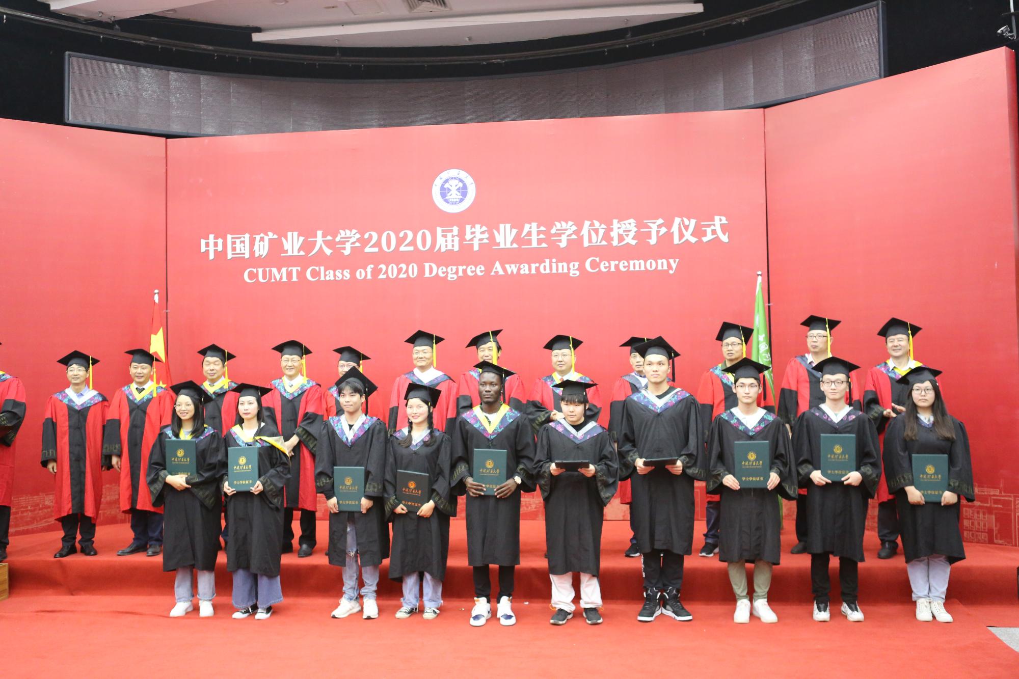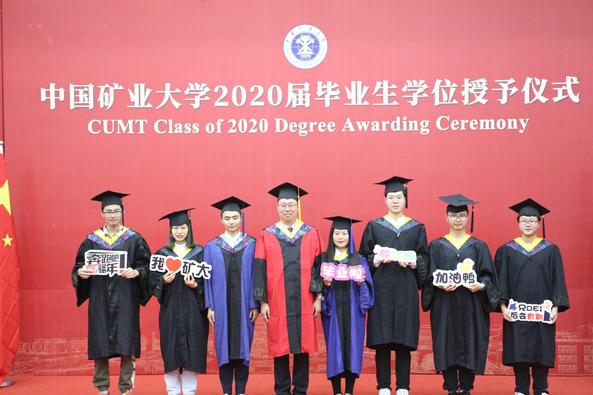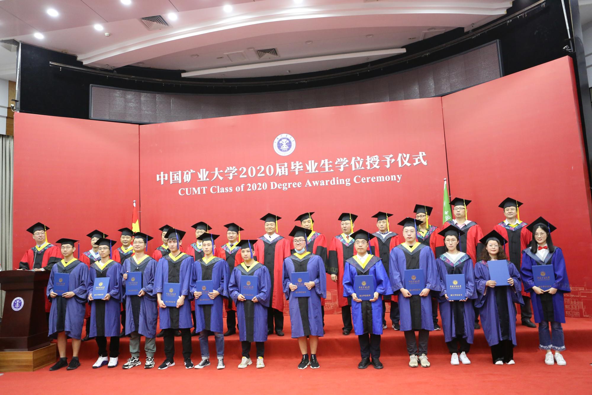 2020届毕业生学位授予仪式在环测楼B109隆重举行。中国矿业大学副校长卞正富教授、教务部部长张绍良教授,学院郑南山教授、汪云甲教授、高井祥教授、胡振琪教授、吴侃教授、汪应宏教授、冯启言教授、郭广礼教授、张书毕教授、田立江教授为毕业生拨苏正冠、颁发学位证书,并同他们合影留念。授予仪式由学院教学副院长周来主持。