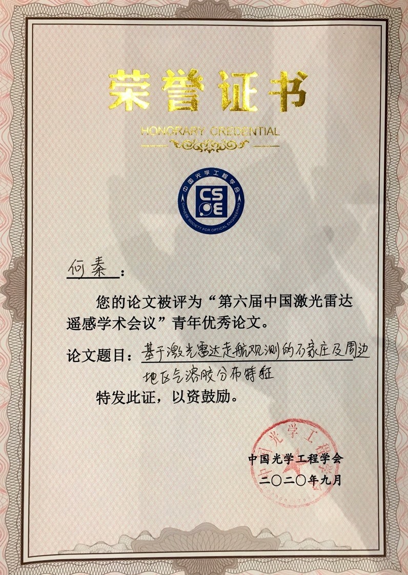 秦凯教授指导的硕士生何秦参加会议,并在激光雷达信息处理技术和应用专题作了题为“基于激光雷达走航观测的石家庄及周边地区气溶胶分布特征”的报告,所对应的论文同时被评为青年优秀论文。与会期间,研究生听取会议报告,并积极与相关领域的专家学者交流讨论,促进了对激光雷达遥感研究现状与未来发展方向的认识。