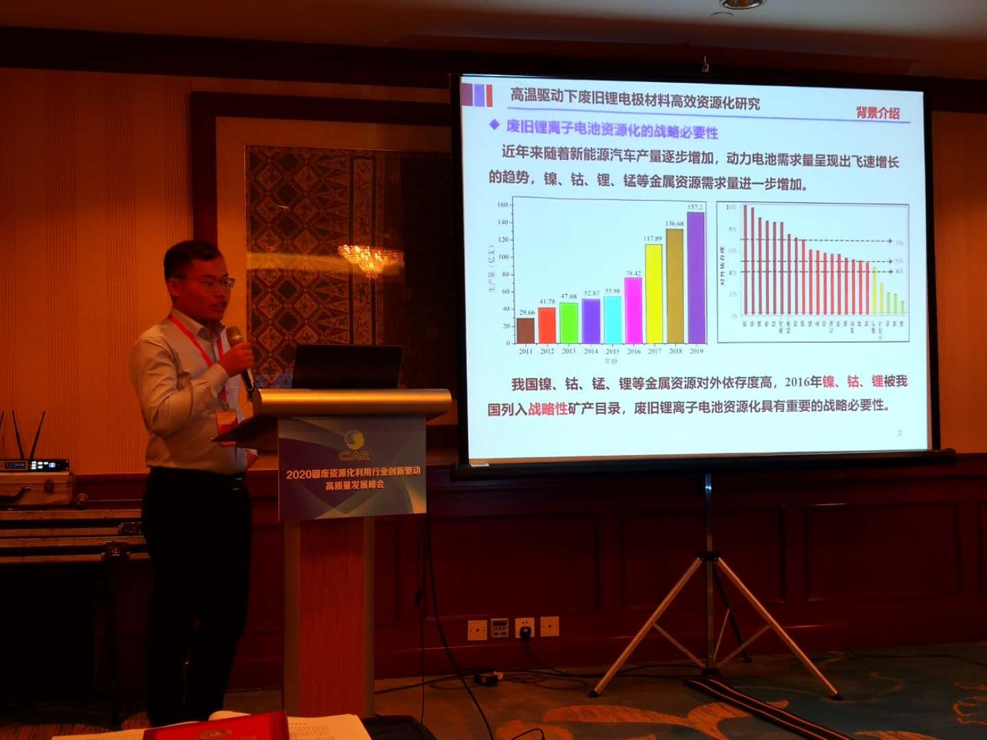 本次大会以“凝聚创新共识、绿色技术引领、共谋发展合作”为主题,以《“十四五”国家技术创新工程规划》编制为契机,谋划“十四五”固废资源化利用行业发展顶层设计,以创新驱动我国固废资源化利用行业高质量发展新动能。会议设置“金属循环利用与电子废弃物协同处置论坛、再制造产业高质量发展论坛、工业固废、废油和高分子材料资源化论坛、再生资源产业联盟青年科技论坛”等4个平行论坛,张光文讲师以“高温驱动下废旧锂电极材料高效资源化研究”为题在“再生资源产业联盟青年科技论坛”中做特邀报告。