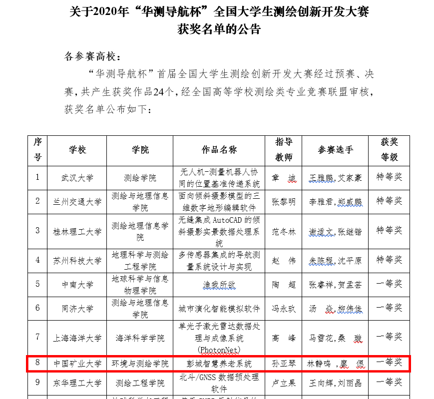 地信2017级本科生林静鸣和廖偲两位同学,在孙亚琴老师、陈国良老师指导下完成的GIS软件开发作品“彭城智慧养老系统”荣获比赛一等奖。