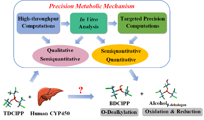 该三相协同策略包括:(I相)通过高通量计算筛选可能的代谢产物;(II相)通过人肝微粒体和P450重组酶在体外实验中确认预测的代谢产物;(III相)通过高水平的靶向计算将实验数据合理化为精准生物转化机制。针对长期存在争议的磷系阻燃剂的生物转化机理,通过从定性到半定量到定量水平的实验和计算协同,揭示了P450酶在代谢进程中存在产生的脱烷基和脱卤化-还原路径机理,尤其在国际上首次报道了P450酶在代谢进程中可发挥连续氧化还原性能。该研究成果将会为对磷系阻燃剂的代谢产物开展毒性测试和生物监测提供重要支撑,而所提出的三相协同策略将会为阐明当前日益增长的新型污染物的精准生物转化机制提供有效手段。