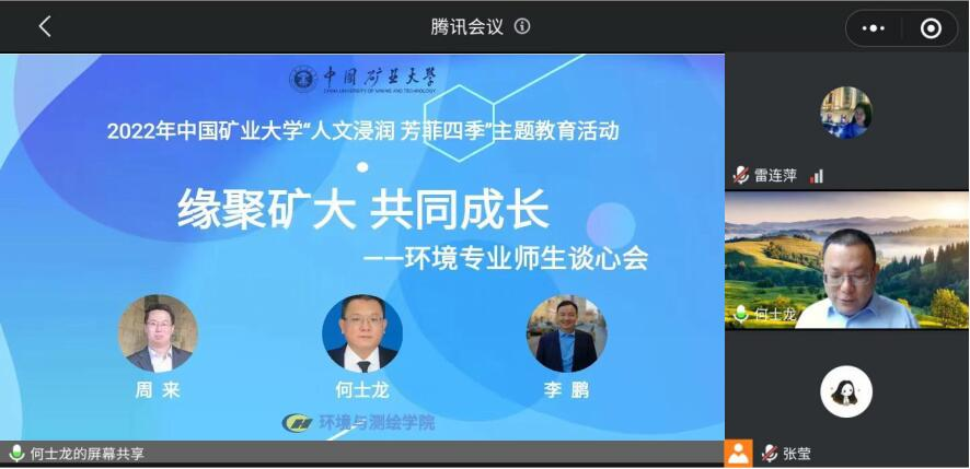 开展“人文浸润 芳菲四季”主题教育活动之“缘聚矿大,共同成长”环境专业师生谈心会。会议邀请了周来副院长、何士龙教授、李鹏副教授作主题报告,院党委副书记韩福顺、学工办主任于海霞、2020级辅导员张莹以及学院环境专业学生参与会议。