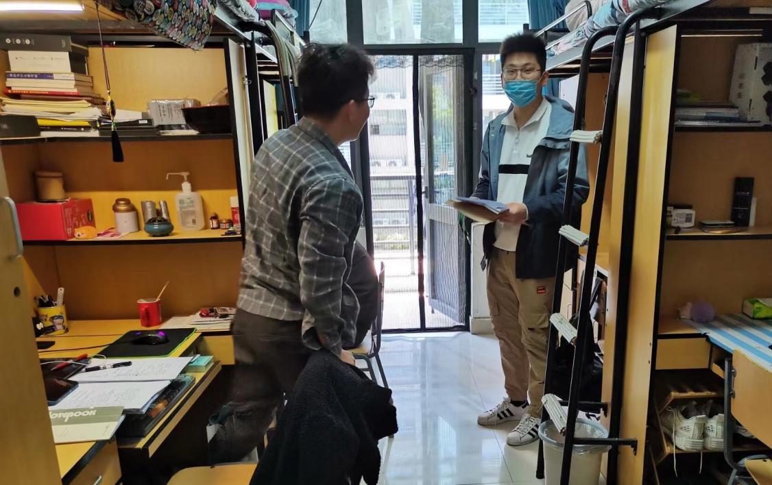 、材物学院、公管学院、计算机学院、能动学院和资源学院的研究生志愿者,走访了兰3宿舍楼研究生宿舍,开展了宿舍清洁卫生、消防安全、值日制度检查工作,并对学生的起居生活、科研学习和心理状态进行了深入了解。