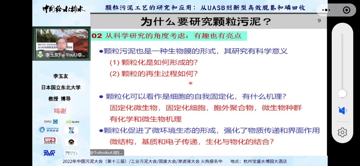 日本东北大学李玉友教授作了题为“颗粒污泥工艺的研究和应用:从UASB到新型高效脱氮和磷回收”的学术报告。报告从UASB产甲烷颗粒污泥、HAP耦合型厌氧氨氧化颗粒污泥、PN/A-HAP耦合型颗粒污泥和同时脱氮除磷、PDA脱氮颗粒污泥四个方面介绍了颗粒污泥在废水处理中的应用。