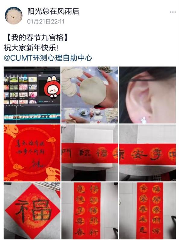 一是积极营造节日氛围,增进家庭团圆相聚。1月5日,院学生会文体部举办了“年年相伴,快乐运动”短视频拍摄大赛,通过互动游戏营造热闹和谐的家庭氛围。1月10日,院学生会办公室举办“臻情年味,悦聚食光”特色活动,鼓励同学们参与到年夜饭的制作中,凸显团圆相聚的春节气氛。1月17日,院团委开展“村晚召集令”才艺展示大赛,用才艺展示增添年味浓度。1月21日,院大学生心理自助中心举办了“我的寒假九宫格”特色活动,分享了全国各地独特的过年习俗。1月31日,院团委举办了“劳育暖冬计划”家务打卡活动,让同学们参与到家务劳动中,进一步增加家庭责任感。