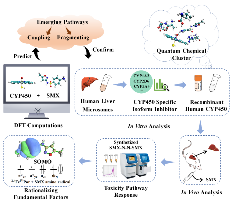 季力课题组在前期研究中发展了计算-实验结合的三相协调策略来用于有效揭示新污染物的非共识代谢路径(Environ. Sci. Technol. 2021, 55, 14037−14050),并被遴选进入中国科学院文献情报中心与美国化学会出版部2022年合作举办世界环境日健康主题期刊封面展。Environmental Science & Technology主编耶鲁大学Julie B. Zimmerman教授点评“作者提出了一种三步协同研究法,揭示了CYP450酶对新型污染物的精确生物转化机制。未来还可通过该法确定由其他非CYP450酶催化形成的对新型污染物的生物转化机制”。近年来,磺胺类抗生素的环境污染已引起广泛的关注,是国际热点环境问题之一。季力课题组针对当前环境中广受关注的磺胺抗生素类污染物的代谢路径展开研究。首先通过计算预测代谢进程中可能发生磺胺自由基碰撞产生磺胺的耦合产物,这一推测产物随后得到了人肝微粒体体外实验的验证,并且进一步得到了小鼠体内实验的确认,在随后的毒性评估实验中发现该耦合产物可对脂质代谢造成干扰而构成潜在的人体健康风险。这是在国际上首次报道了磺胺抗生素耦合代谢产物的存在。最终通过对磺胺自由基的基本性质研究发现自旋离域导致氨基自由基的供电子能力减弱是磺胺发生耦合的本质因素,从而该机理可推广到所有磺胺和含氨基类化合物的代谢进程,直接作用于胺类新污染物的生物监测。该工作于3月15日以封面论文在线发表于Environmental Science & Technology(//pubs.acs.org/doi/10.1021/acs.est.3c00071)。