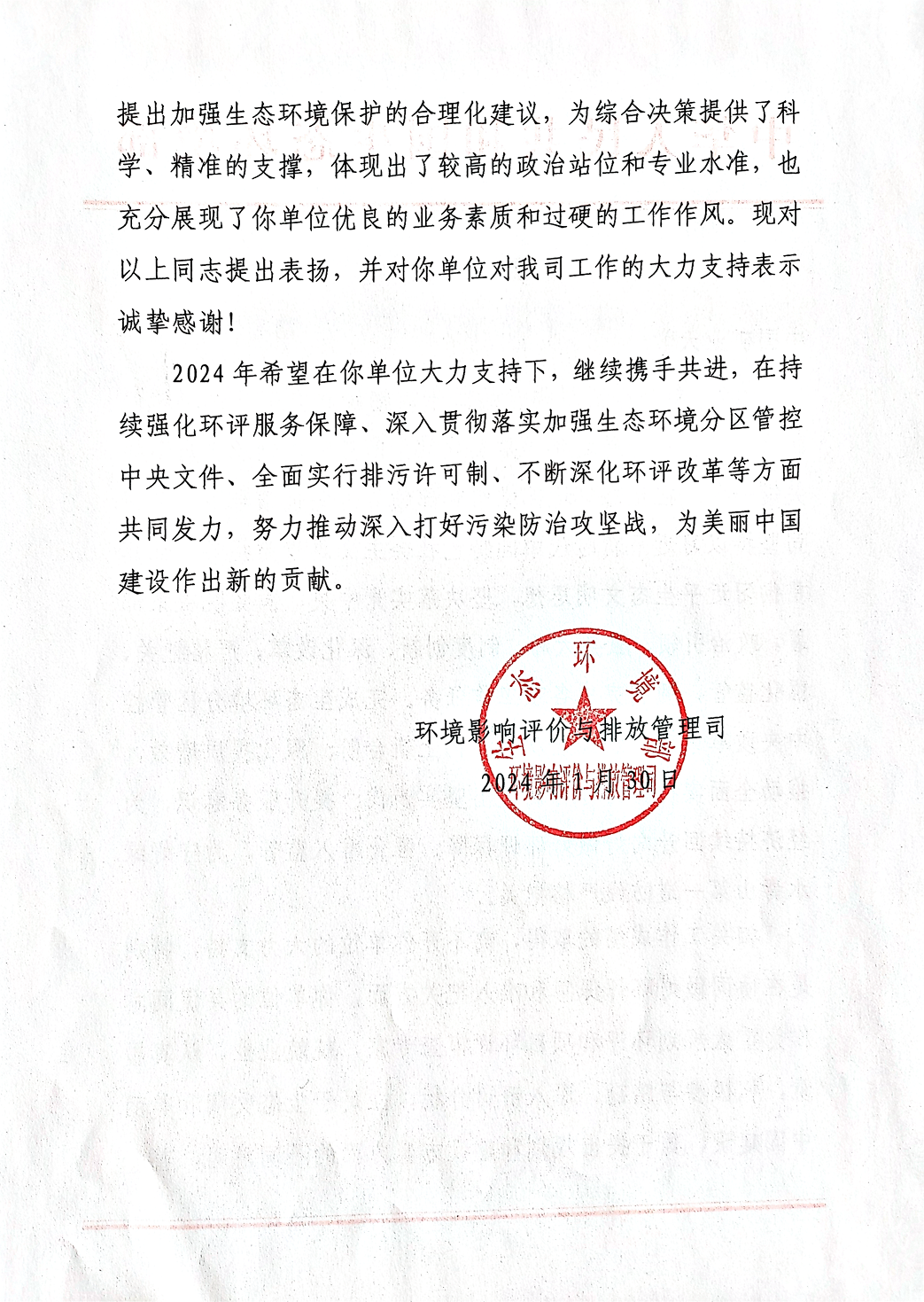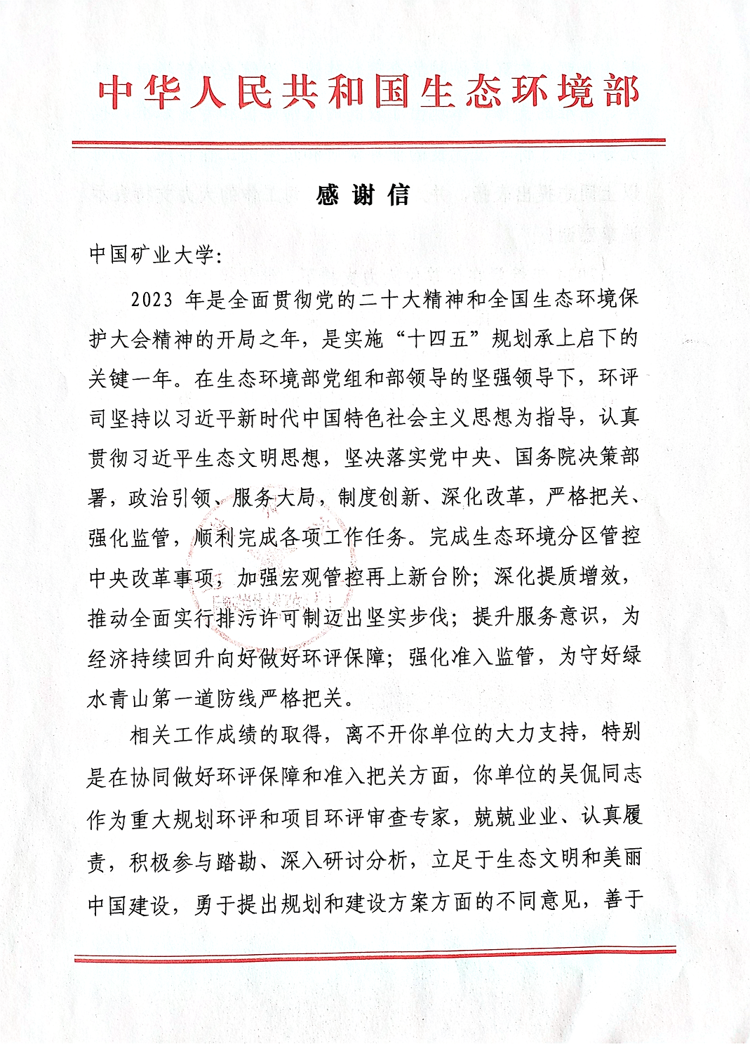 近日,生态环境部环境影响评价与排放管理司向我校发来感谢信,感谢2023年我校对生态环境部相关工作的大力支持。信中提及在协同做好环评保障和准入把关方面,明升体育 吴侃教授作为重大规划环评和项目环评审查专家,认真履责,勇于提出规划和建设方案方面的不同意见,善于提出加强生态环境保护的合理化建议,为综合决策提供了科学精准的支撑。