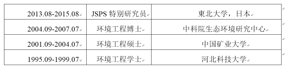 教授 2010.01-2020.12 中国矿业大学环境工程系副教授 2007.07-2009.12 中国矿业大学环境工程系讲师 1999.07-2001.09 河北恒源环保公司助理工程师