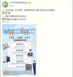 3.安全案例警示教育。各年级常态化开展防疫安全、人身安全、财产安全教育,通过官方微信平台、QQ公众号推送防诈骗提醒,各年级在年级群设立安全教育小贴士,及时向同学们进行案例警示教育。